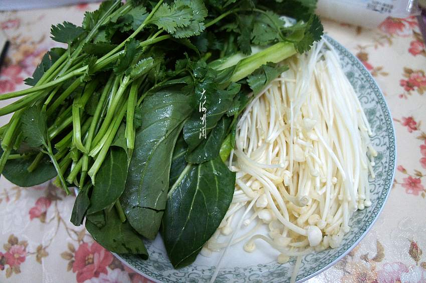 9、配菜金针菇,去掉根部洗净,油菜择洗干净,青菜类随自己的喜欢的口味搭配,没有特别要求;