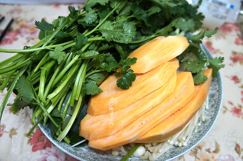 10、香菜择洗干净,红薯去皮洗净切片。根据自己的喜好,也可用土豆、白萝卜等可切成片状来替代;