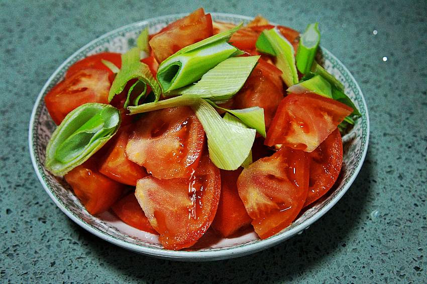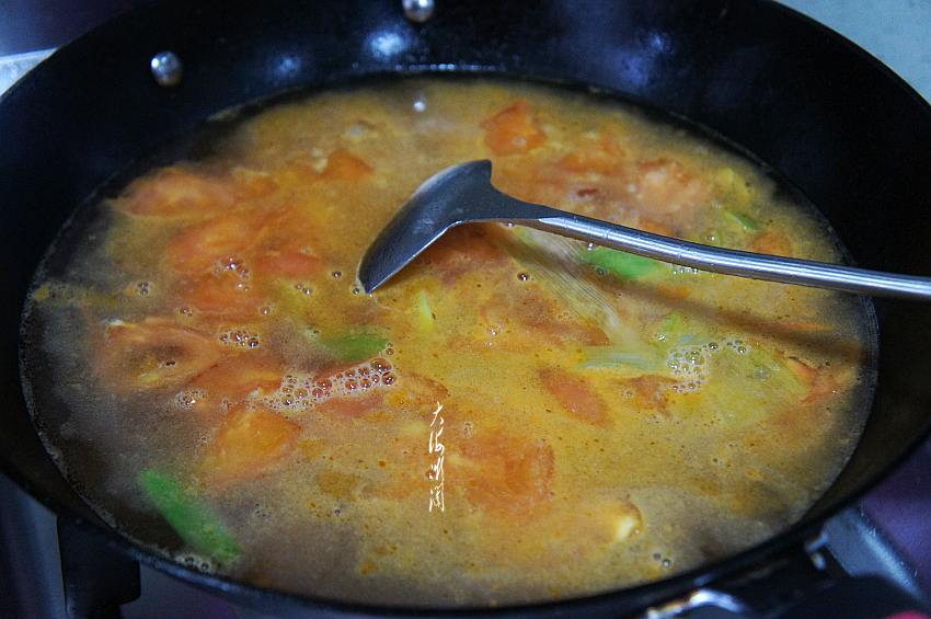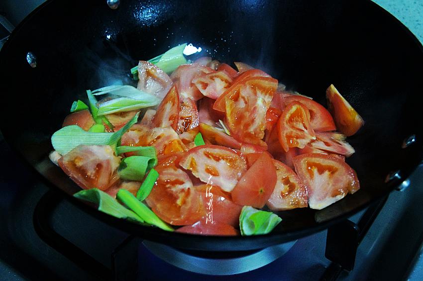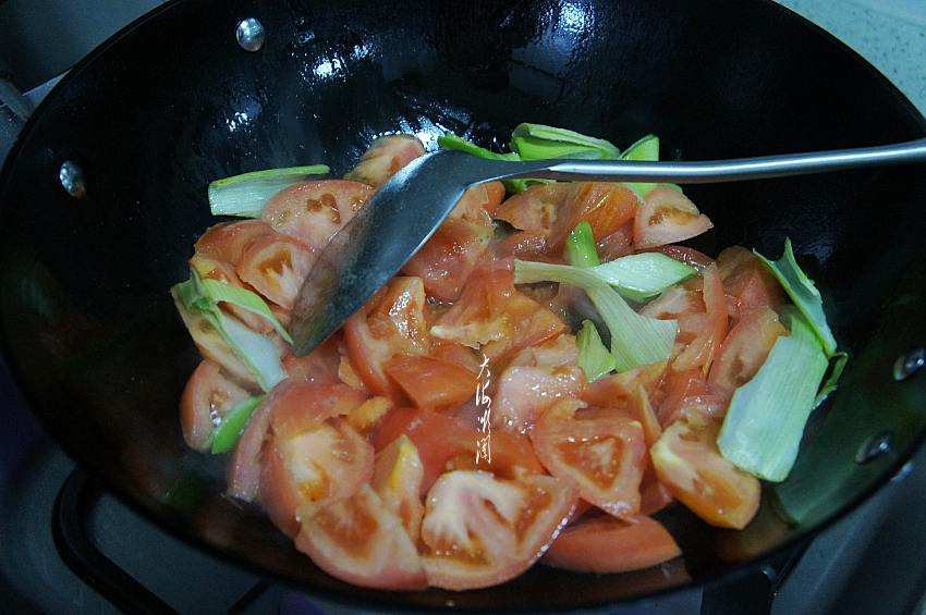 2、炒锅加入适量的油,爆香葱姜蒜片,下入西红柿翻炒;