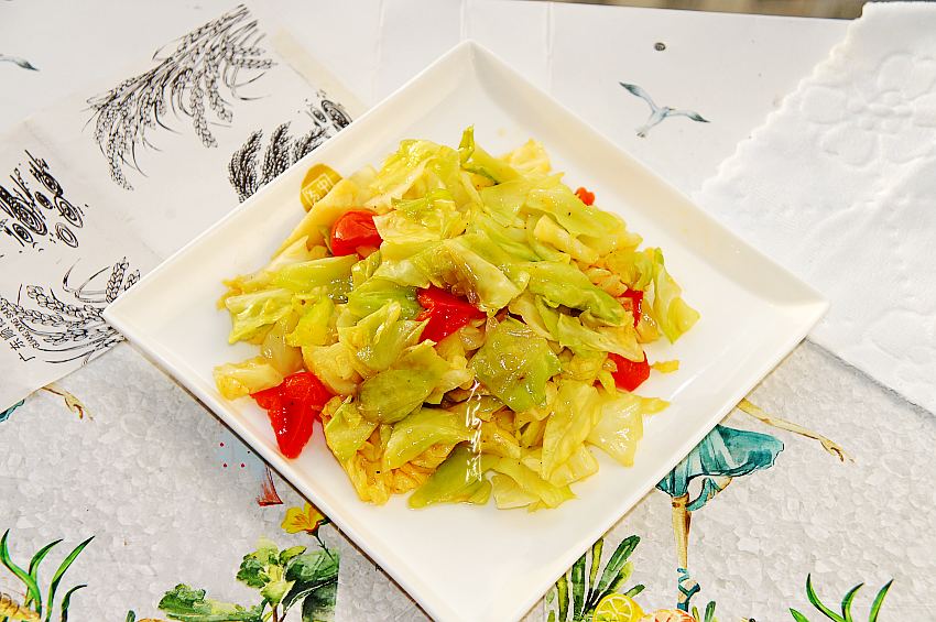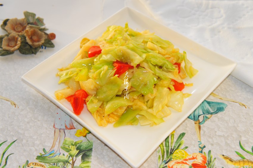 【爆炒甘蓝菜】所需食材:甘蓝菜半个;红椒半个;油适量;盐适量;花椒粒适量;蒜适量 ;生抽适量;胡椒粉少许;辣椒油适量。