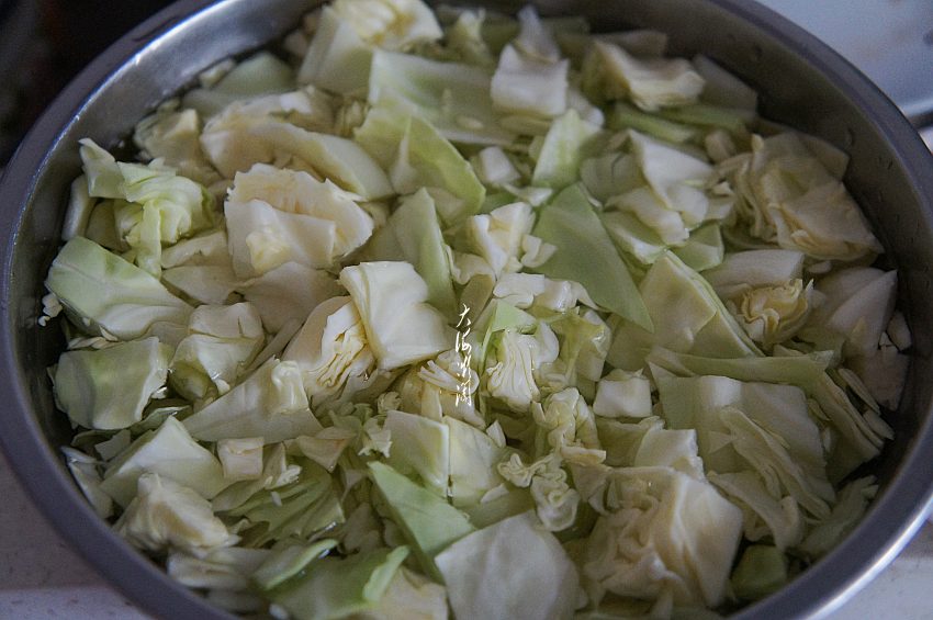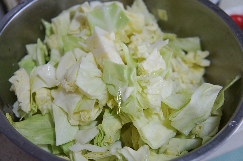 2、甘蓝菜切块,加入适量的水,撒些盐腌制几分钟再清洗两次;