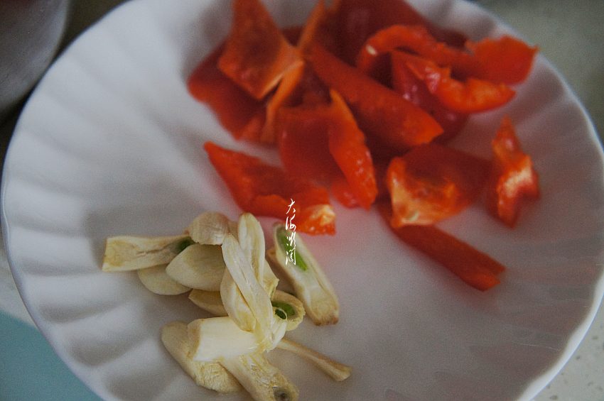 3、红椒洗净切片,大蒜去皮洗净切片;