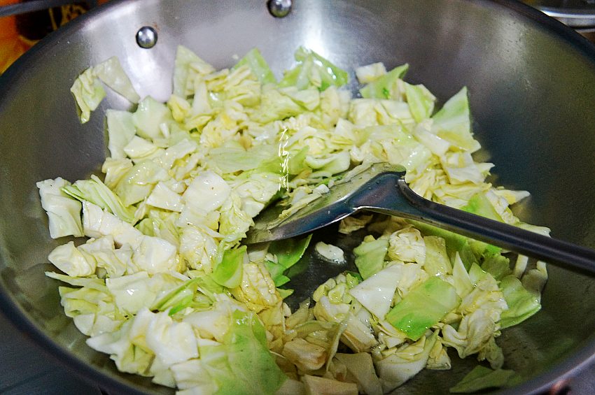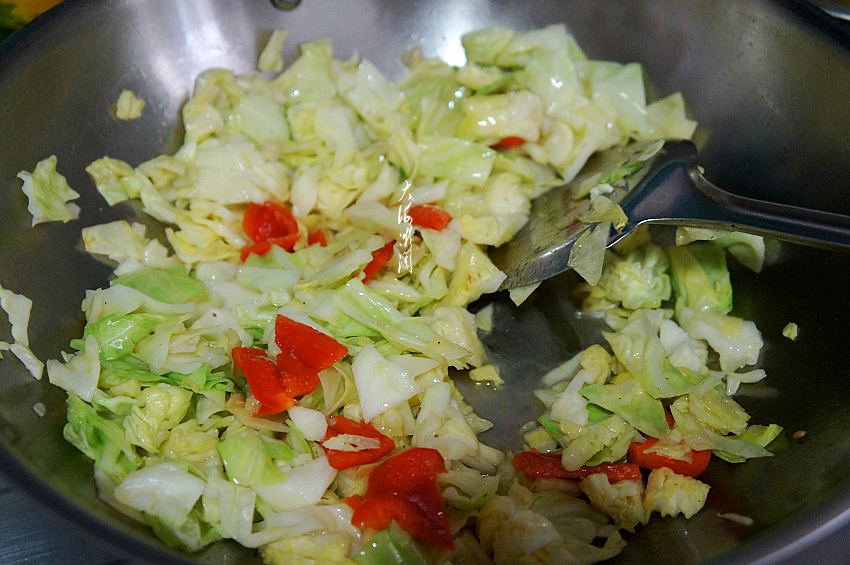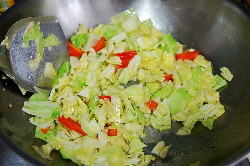 5、炒锅加入适量的油,炸香花椒粒取出扔掉,爆香蒜片,加入甘蓝菜大火爆炒;