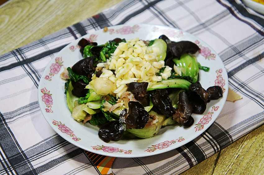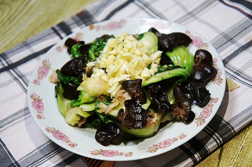 【油菜炒黑木耳】所需食材:油菜1棵;黑木耳适量;猪肉适量;油适量;盐适量;葱适量;五香粉适量;大蒜适量;醋少许;生抽少许。