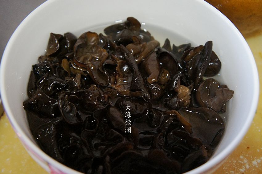 2、黑木耳泡发,摘洗干净,焯水后备用;