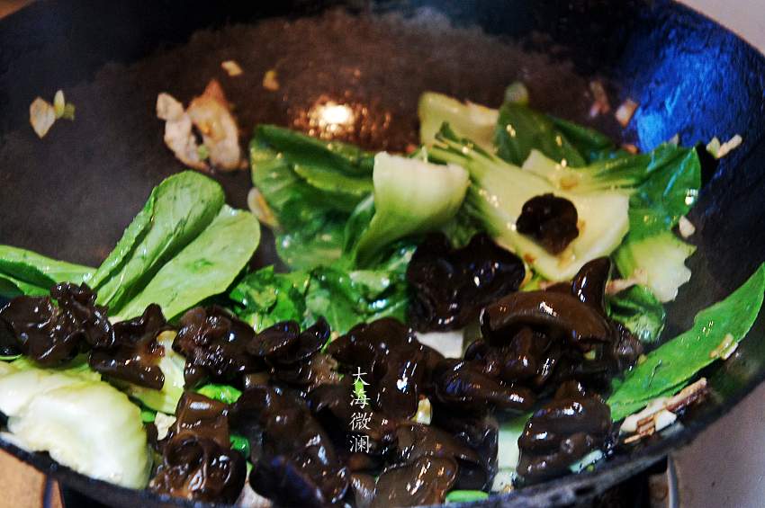 6、加入黑木耳翻炒,加入盐、少许蒜末、少许生抽调味;