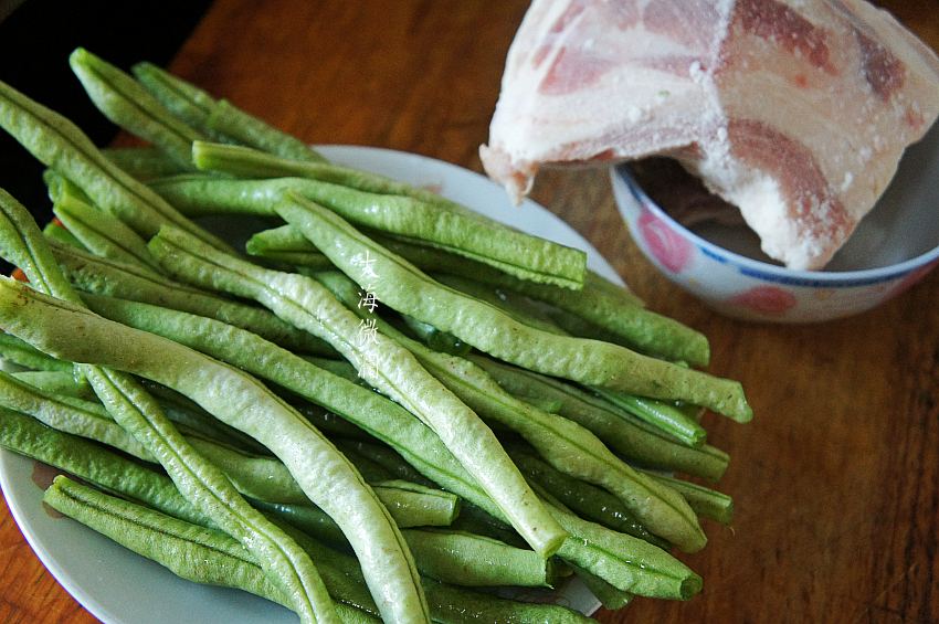 做法:1、备齐材料,架豆角洗净备用,冷冻的五花肉解冻,洗净;