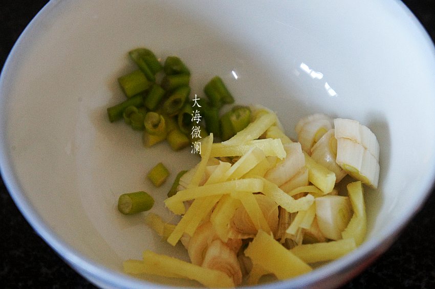 3、葱去皮洗净切碎;姜去皮洗净切丝;