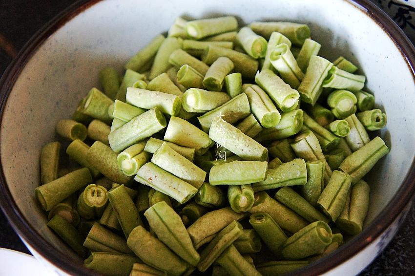 4、架豆角洗净切段儿,切的短一点更容易入味;