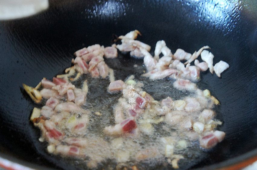 5、炒锅加入适量的油,爆香五香粉、葱姜,加入腌制好的肉丁翻炒均匀,肥肉还可以下一下油;