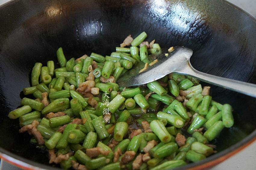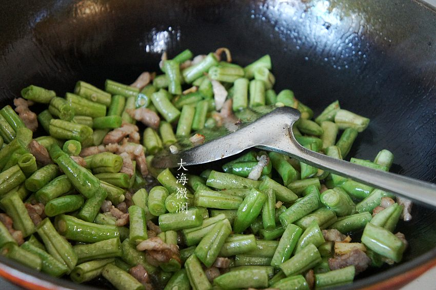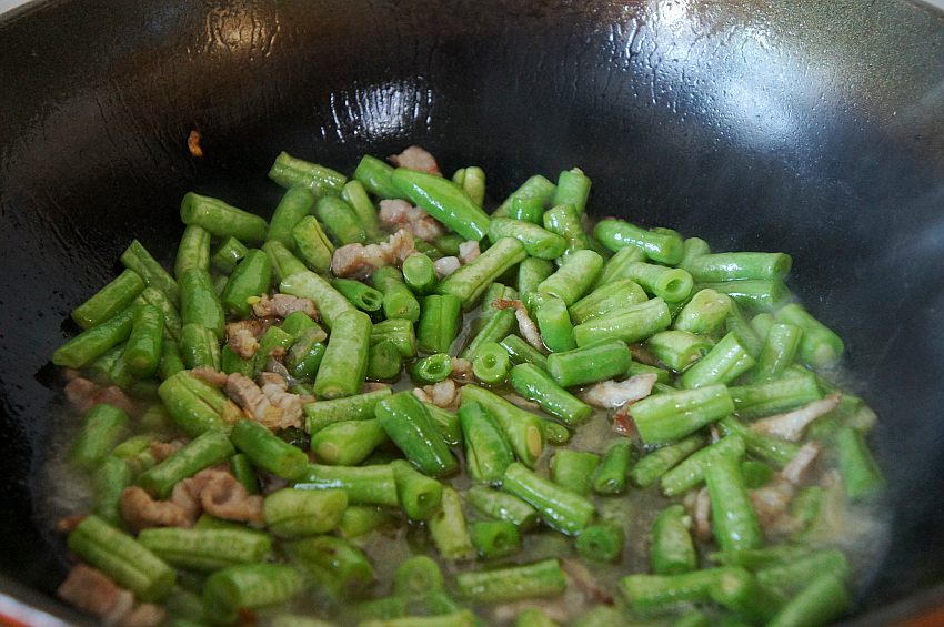 6、加入架豆角翻炒至豆角变软;