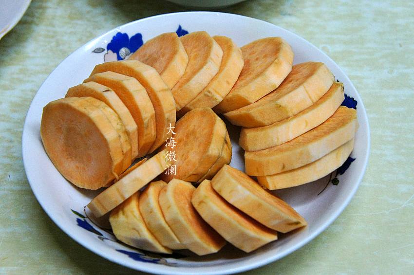 3、红薯去皮洗净切片,即使主食也是菜,每次火锅比配的食材;