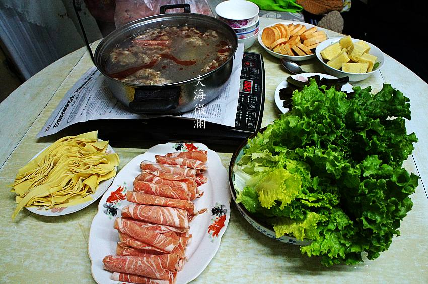 做法:1、先烧一壶开水,电磁炉坐上火锅,加入开水,加入火锅底料高温煮开,就可以下入羊肉、各种喜欢的蔬菜了。原则上先下入耐煮食材,比如海带根要先下入锅中煮,然后根据自己的喜好下入羊肉、蔬菜,其实除了抗煮食材,涮火锅没有先后顺序,自家吃喜欢吃啥就入锅涮啥,边煮边吃,最后再来点手擀面,真是好吃到撑。注意不时的用漏勺撇去上边的浮沫,温度要实时控制,别烫伤就好;