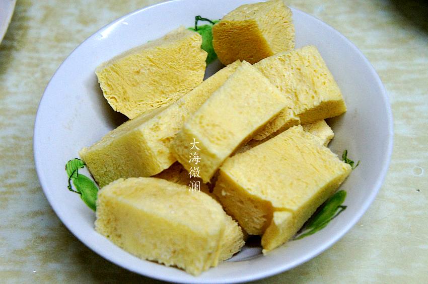 4、冻豆腐,东北的冻豆腐都是卤水豆腐,细腻,蜂窝多,放在火锅里一煮,吸满了汤汁,嚼起来劲道好吃,有肉的口感,比肉还香,还能吃出原汁原味的豆香;
