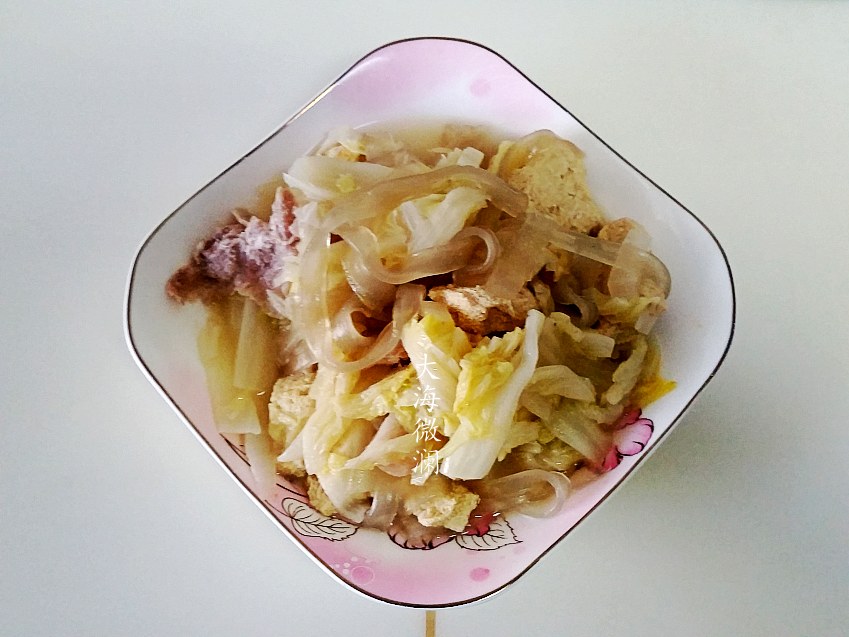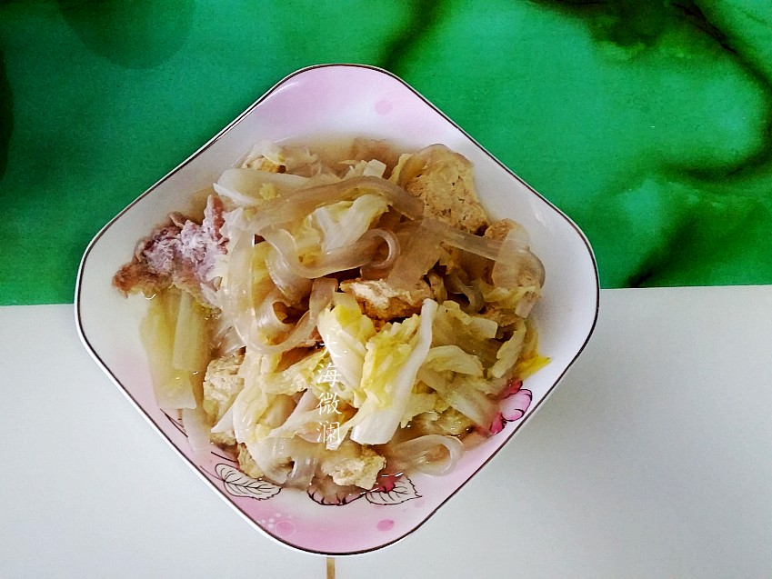 这道大炖菜是东北农村最普通的家常菜,主要食材是物美价廉的大白菜,加上猪肉、粉条、冻豆腐,既有酸菜猪肉炖粉条的特色,又有杀猪菜的味道,多加一些猪肉还可以出一道蒜泥蘸白肉,经过炖煮,白肉的油脂已经融入菜汤中,香而不腻,蘸蒜泥吃那就是过年的感觉,小时候只有过年才能吃到这样的蒜泥白肉。粉条Q弹滑润,劲道有嚼头。冻豆腐吸收了足够的汤汁,肉的鲜与香全部进入冻豆腐里,用筷子夹起一块冻豆腐您先得慢慢的吸食豆腐蜂窝里的汤汁,那味道美极了,而且冻豆腐嚼起来有肉的口感,比肉还香,还能吃出原汁原味的豆香。俗话说“鱼生火,肉生痰,白菜豆腐保平安”,冬季空气特别干燥,白菜其性微寒,有清热除烦、解渴利尿、通利肠胃、清肺热之功效。想要清热燥湿,利水,利胆,可多吃大白菜这样的清热利水的食物哦。