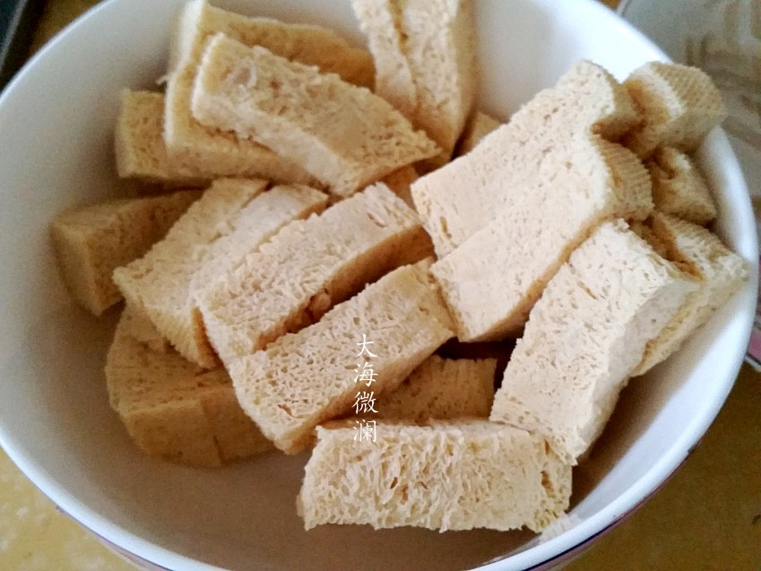 3、冻豆腐解冻,切块攥掉水份,这冻豆腐是农村亲戚送来的,特别有豆香味;