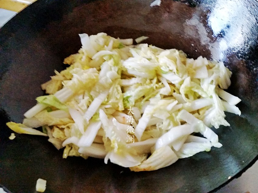 5、炒锅加入适量的油,爆香五香粉和葱姜,加入白菜翻炒;