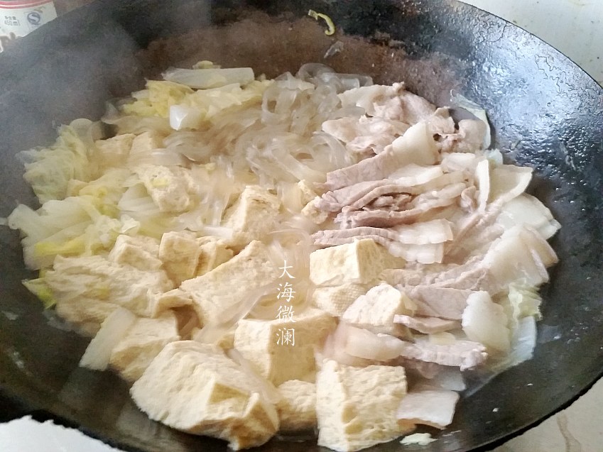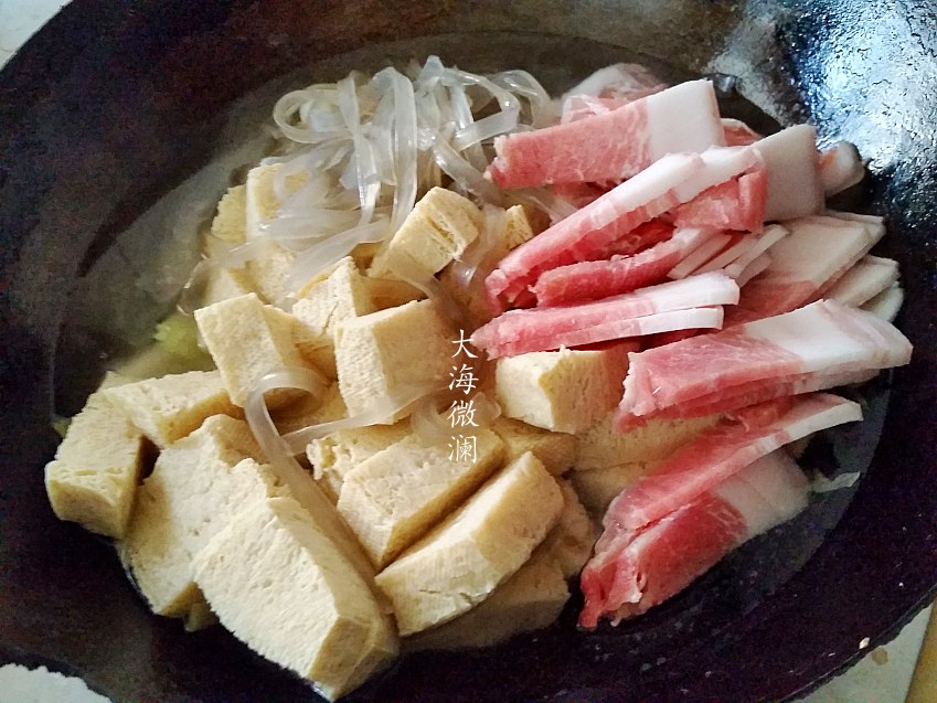 7、加入猪肉、粉条、冻豆腐,大火烧开,小火炖至猪肉熟;