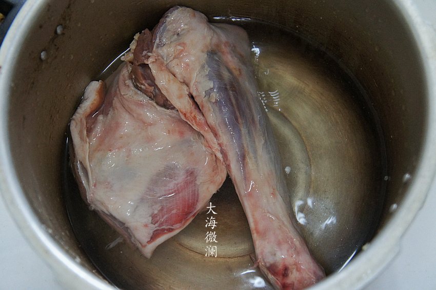 2、浸泡好的羊腿放入高压锅中,加入适量的水;