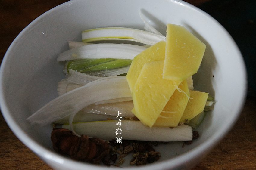 3、葱、姜去皮洗净切段、切片,各种调料过水冲一下;