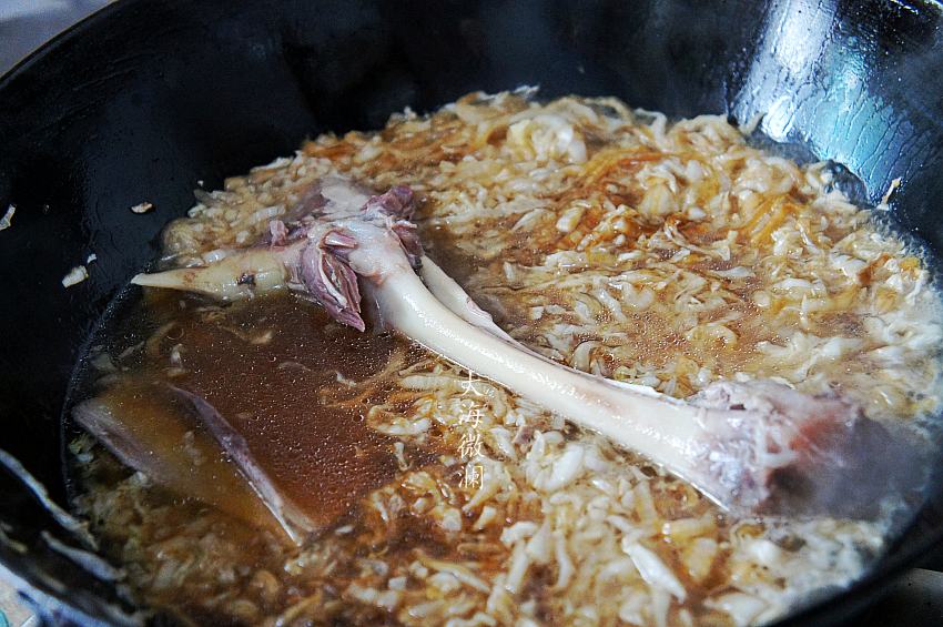 10、加入适量的烀羊肉的羊汤,加入羊腿骨和羊肉大火烧开,中火炖5-10分钟左右;