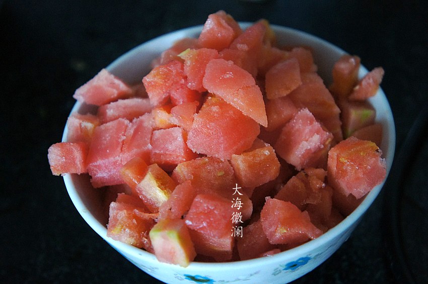 4、番茄洗净切丁,我这番茄是自家种的绿色食材,秋天冻在冰柜了,可以吃一个冬天;