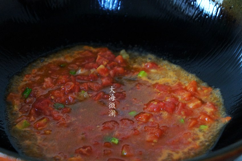 5、炒锅加入适量的油,爆香五香粉和葱花,加入番茄丁翻炒至番茄融化出汤汁