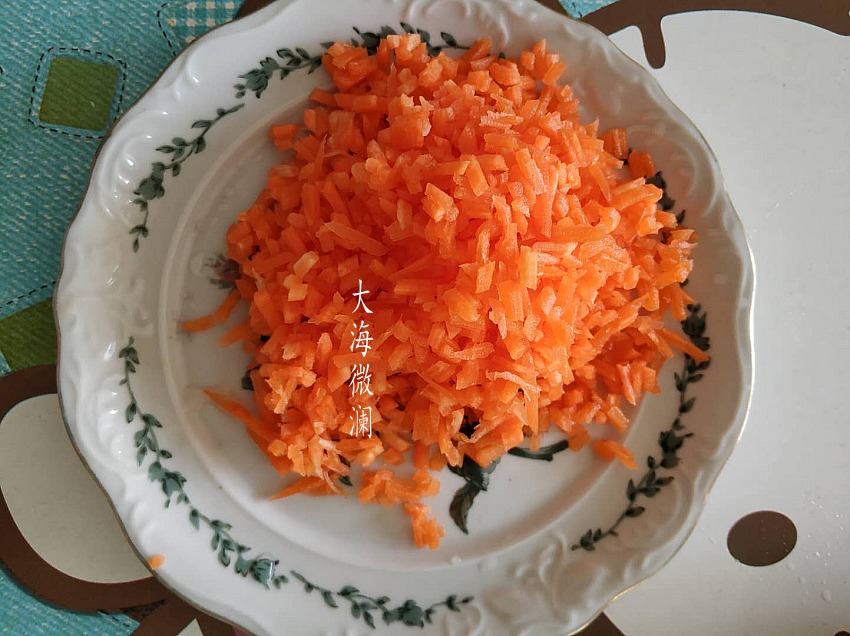 2、胡萝卜洗净切碎,也可以用擦板擦成细丝,不用切碎;