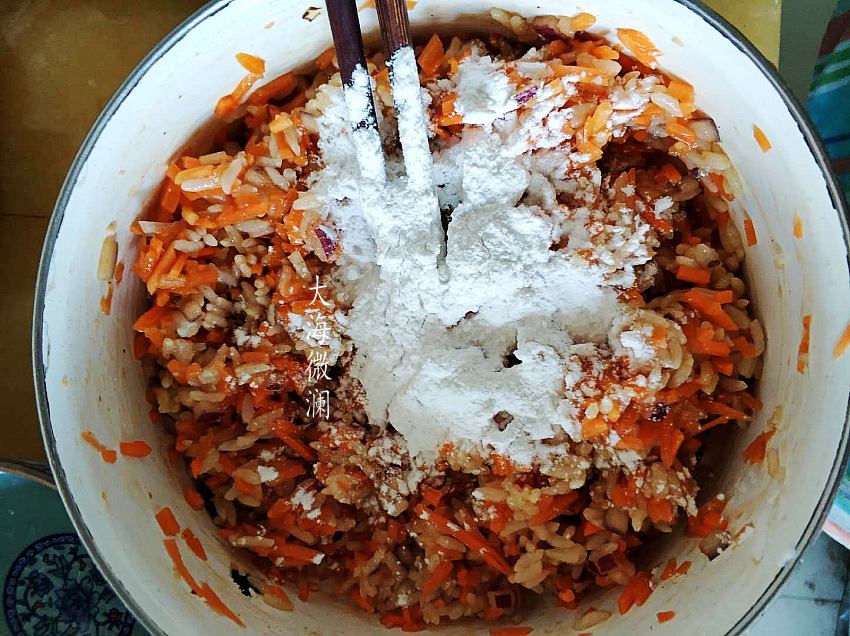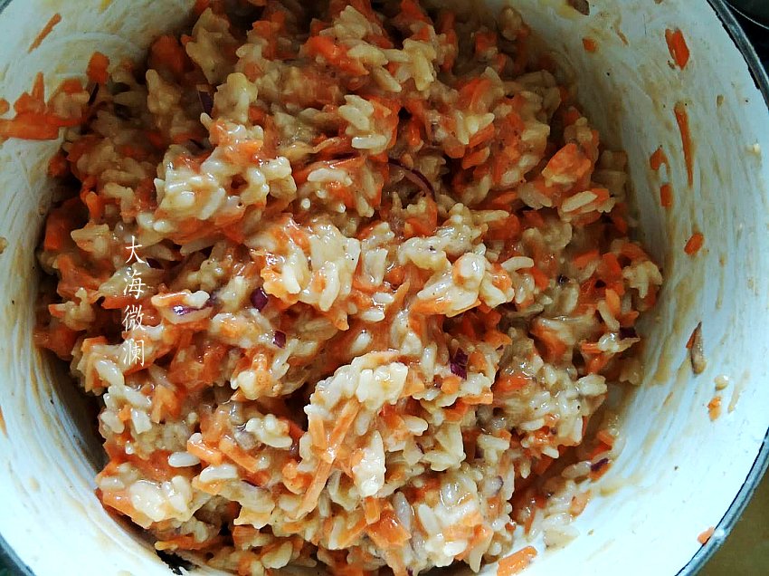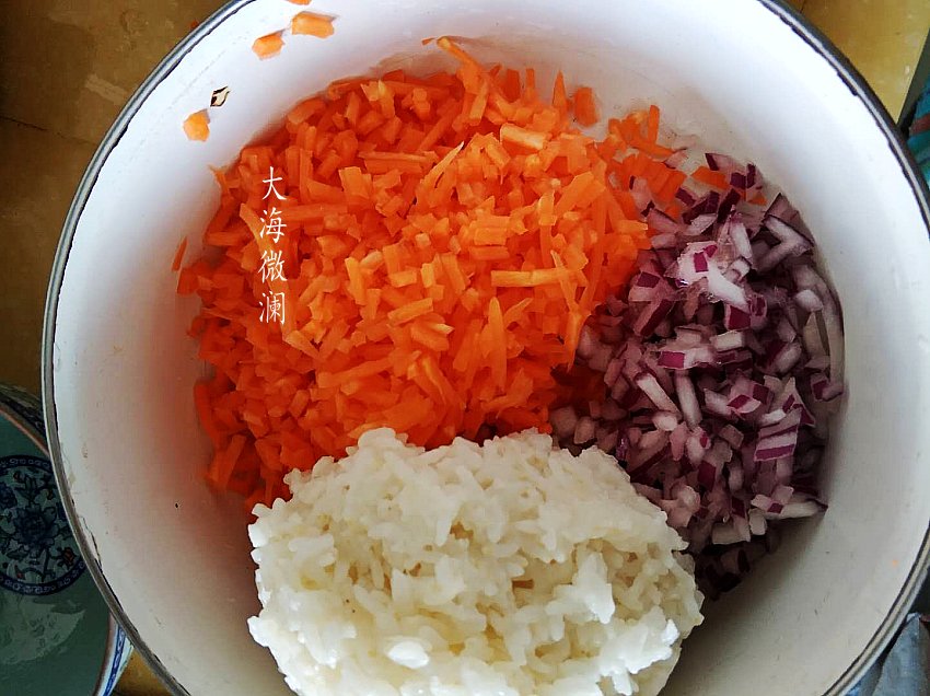 4、取大盆加入胡萝卜碎、米饭、洋葱碎;