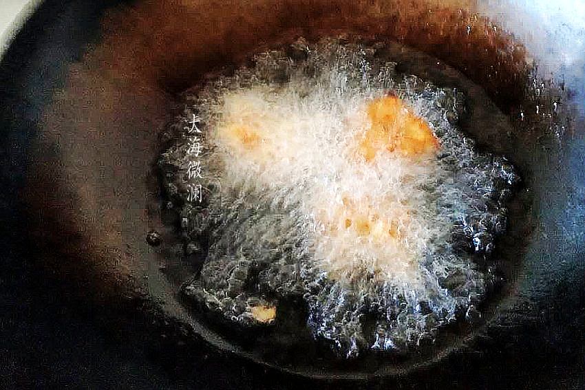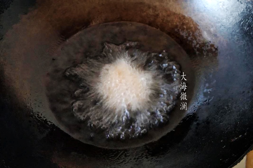 6、锅中加入适量的油,中温加热至七成热,用小勺舀一勺一个丸子下入油锅中;