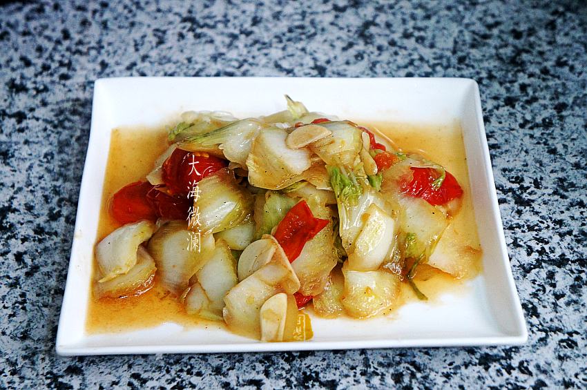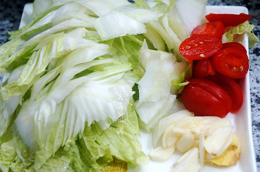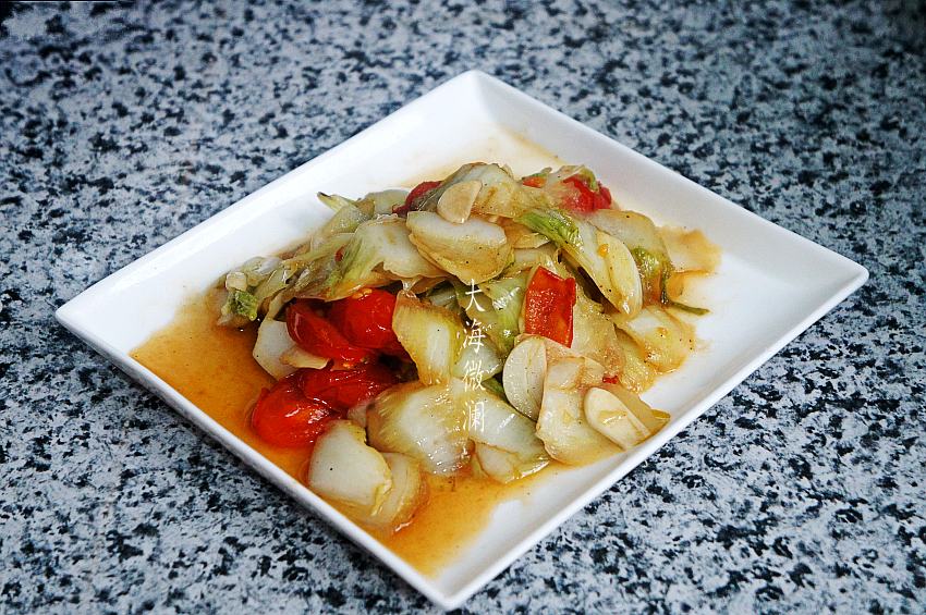 做法:1、白菜心和圣女果都在淡盐水中浸泡10分钟,反复清洗干净,白菜斜切薄片;圣女果切片;