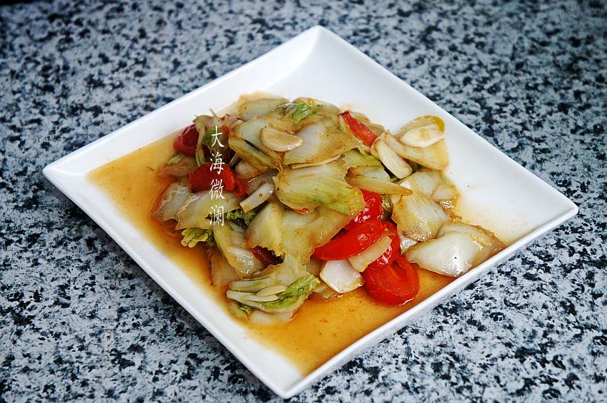 【素炒白菜片】所需食材:白菜心1个;圣女果5个;油适量;盐适量;五香粉适量;蒜适量;姜少许;糖适量;海鲜酱油适量。