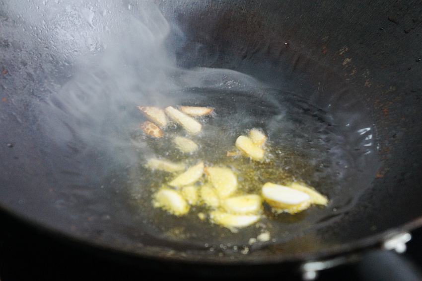 2、大蒜去皮洗净切片,姜去皮洗净切片。炒锅加入适量的油,爆香五香粉和姜、蒜片;