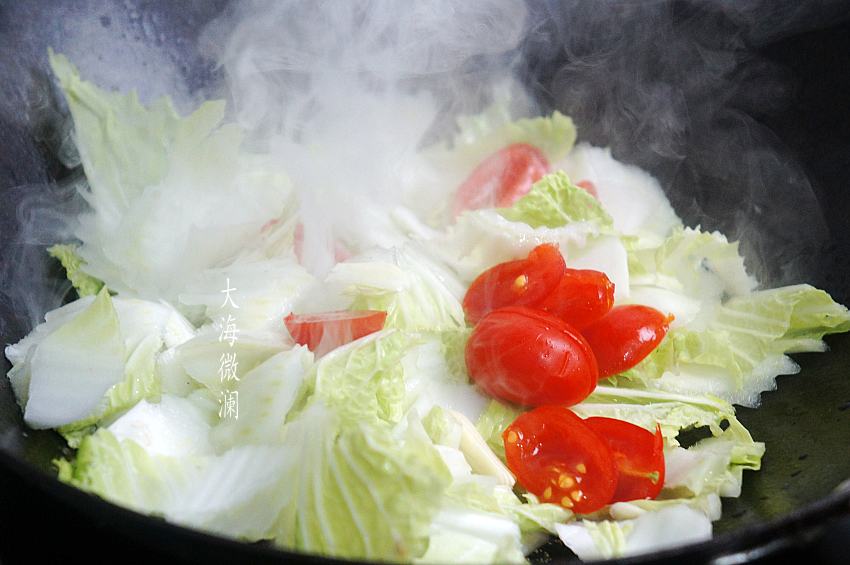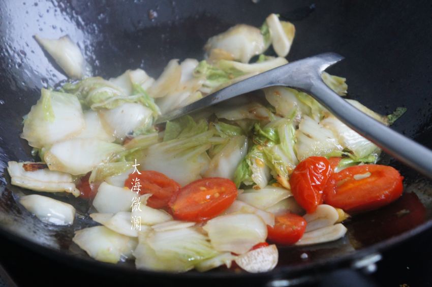 3、加入白菜片大火爆炒,再加入圣女果片翻炒;
