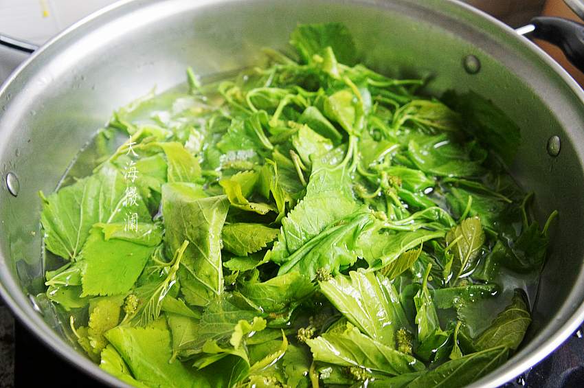 2、桑葚叶摘洗干净,反复清洗干净,锅中加入适量的水,水开焯烫桑葚叶,过冷水攥掉水分;
