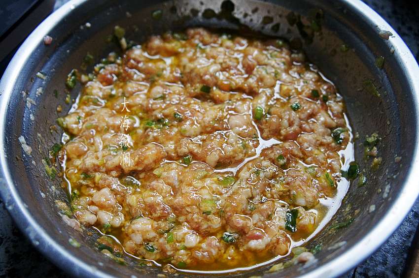 4、猪肉切碎,加入葱、姜碎,胡椒粉、盐、五香粉、胡椒粉、生抽、少许老汤,沿着一个方向搅拌上劲,炸点花椒油倒入肉馅中搅拌均匀;