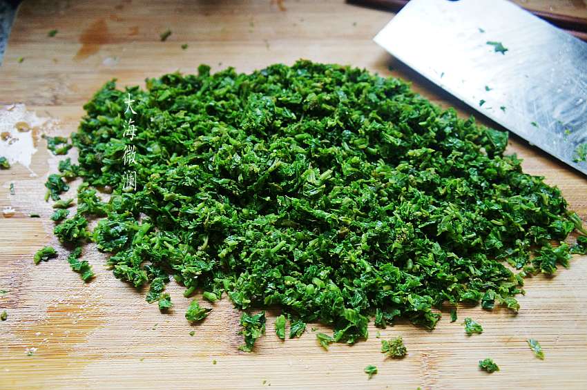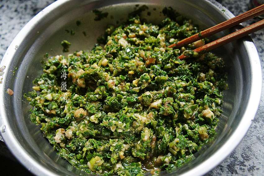 【水煎烫面桑葚叶馅饼】所需食材:高筋粉300g;猪肉300g;桑葚叶200g;油适量;盐适量;五香粉适量;胡椒粉适量;葱适量;姜适量;生抽适量;