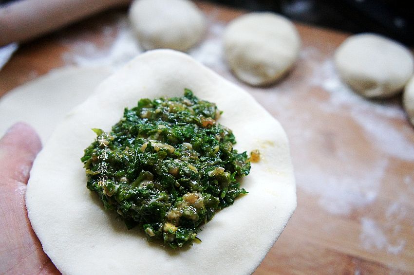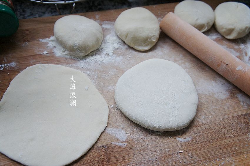 7、将面团分成若干小面团,擀成面饼,包上馅轻轻擀匀;