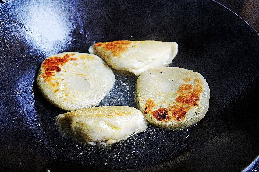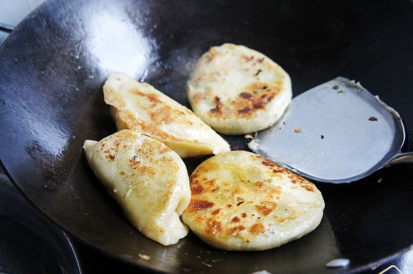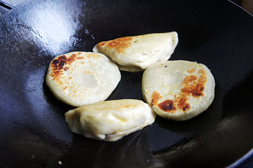 11、没有水分时打开锅盖,馅饼就煎好了;