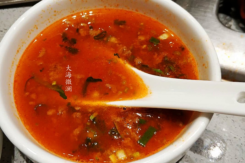 【番茄牛肉粒汤】没开涮之前这碗汤一定要喝,因为它是火锅底料的精华,加上牛肉粒和葱花、香菜调制的汤汁,牛肉粒的香,配上酸酸甜甜的汤汁,太好喝了,要不是奔着后边的涮火锅,真想再来一碗汤。