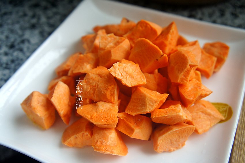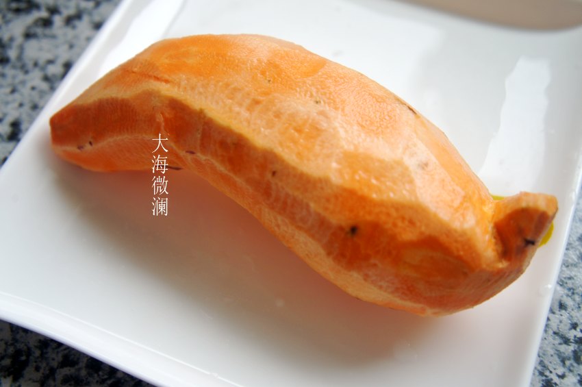 做法:1、准备食材,红薯去皮洗净,这边的红薯都是这种颜色的,特别甜;