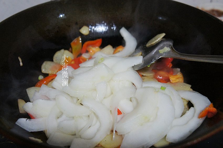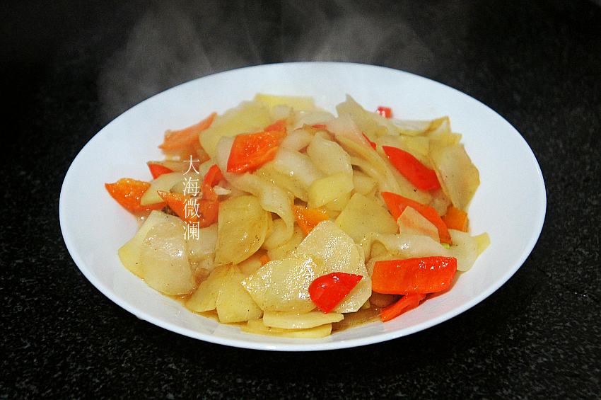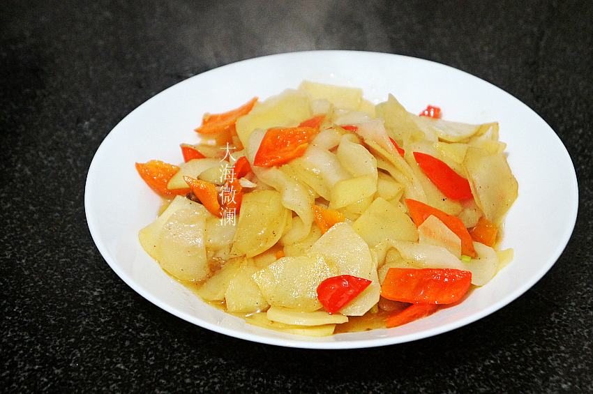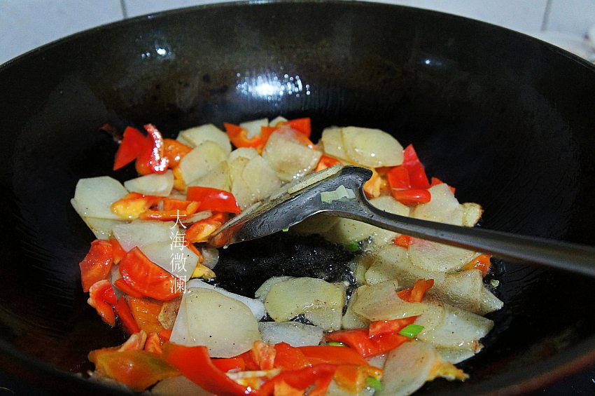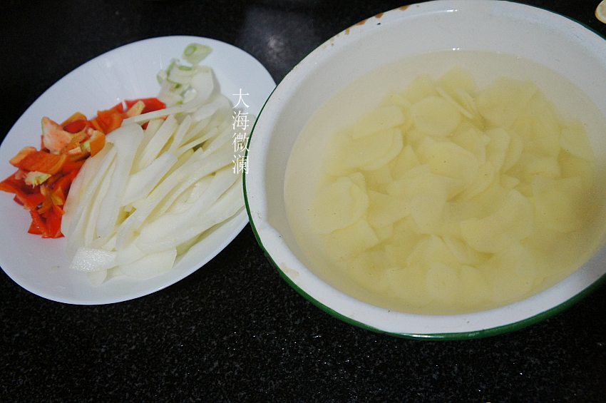 2、土豆片一定要泡出淀粉再炒,不粘还爽口,泡出来的淀粉刚好用来勾薄芡。
