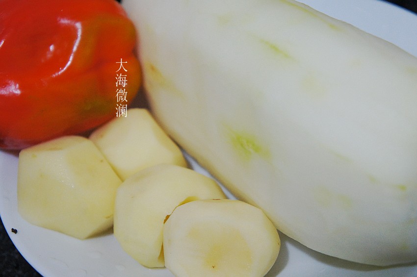 2、小土豆切片,冷水浸泡出淀粉后捞出控净水分,老黄瓜切片,红椒切片;