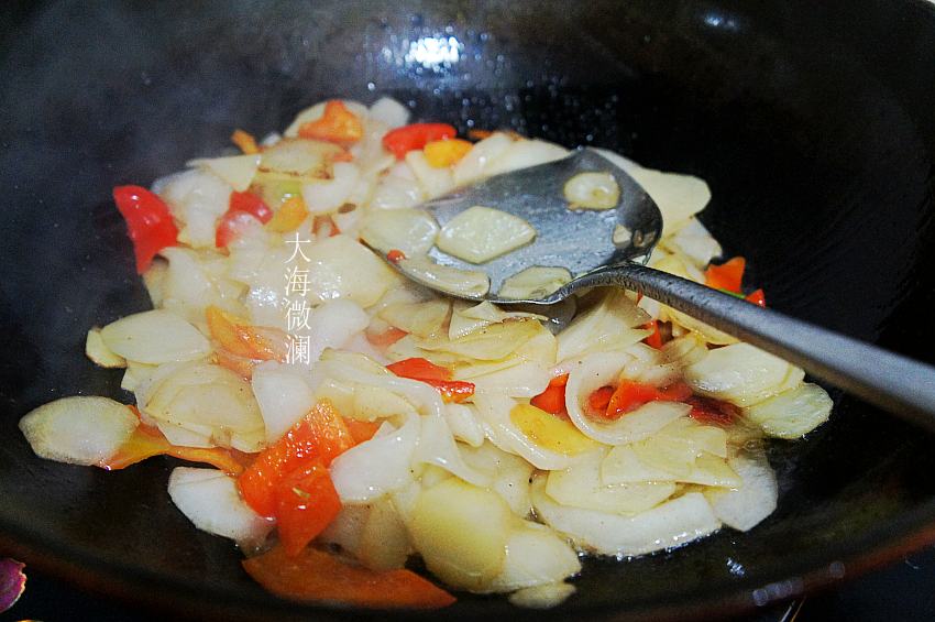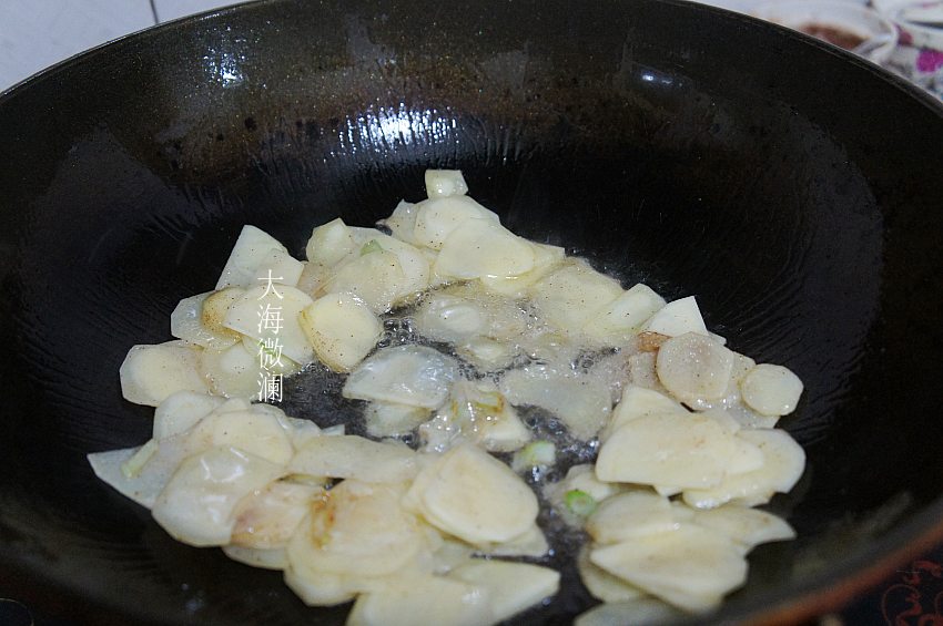 3、炒锅加入适量的油,爆香五香粉和葱花,下入土豆片翻炒;