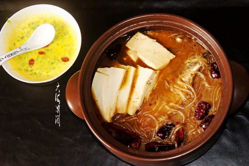 食材:鲫鱼2条;豆腐半块;粉条100克;五花肉150克;油适量;葱姜适量;花椒大料适量 ;白菜叶3片;香其酱100克;生抽适量;香叶2片;肉桂1块;干红椒 1个;料酒适量。