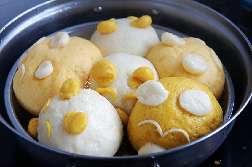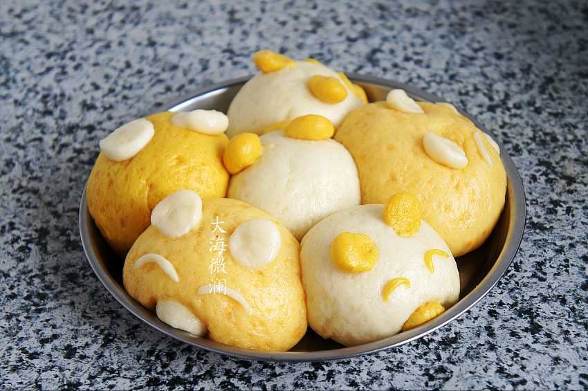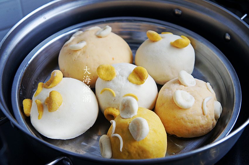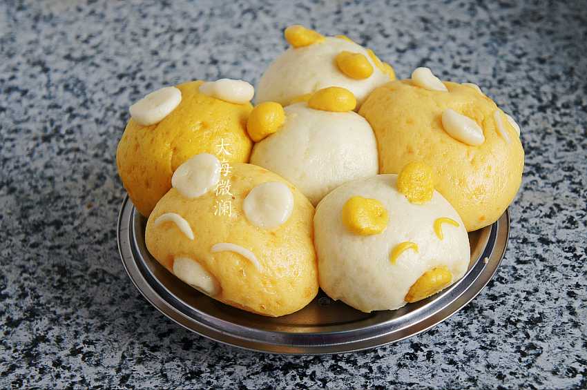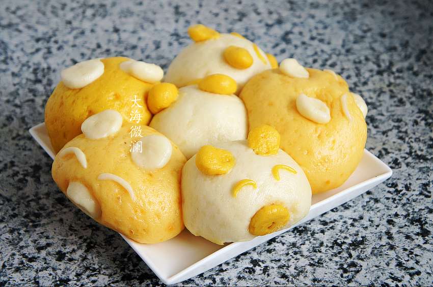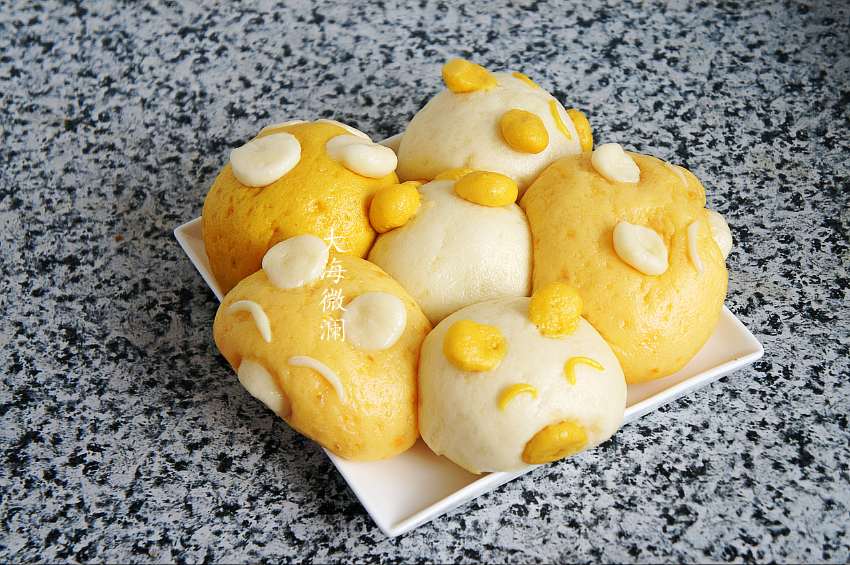 5个小猪挤在一个盘子里,呵呵,这里没有蒸锅,用盘子做蒸帘,没想到蒸出来还是很不错的哦!既有年味,还有成就感,蛮喜庆的!其实蒸馒头真的很简单,一碗面粉加点酵母发个面团,喜欢的可以搭配各种颜色,我今天用了南瓜粉和红薯,颜色比较接近,白馒头一样特别好吃。我更喜欢自然发酵,不过这边不是很方便,厨房用具太少,酵母发酵还是比较快的,大约一个多小时就OK 了!如果您也喜欢,不妨试试,给家人蒸上一锅大馒头吧,满满的都是幸福与快乐!指不定来年就发发发啦!