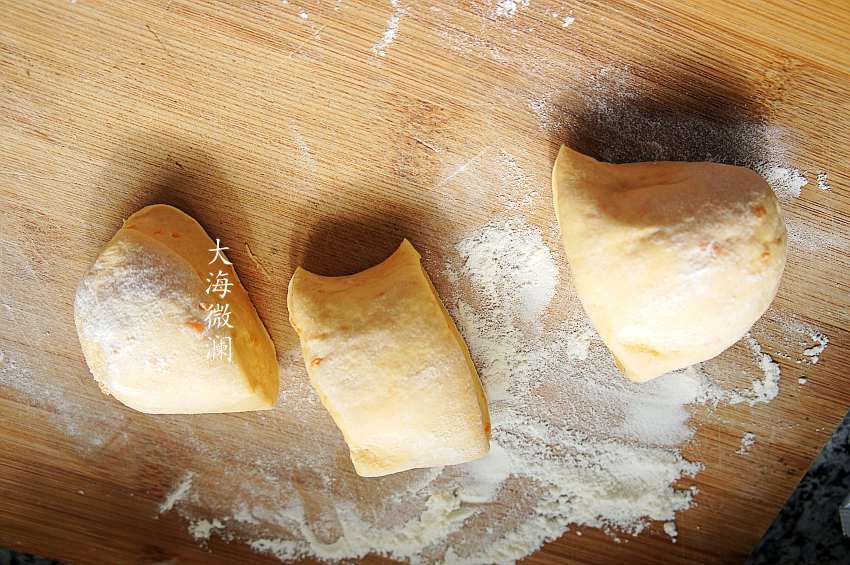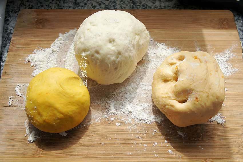3、发酵好的面团一分为三,一份用红薯泥揉匀,一份用南瓜粉揉匀,也可以提前揉匀后再发酵;