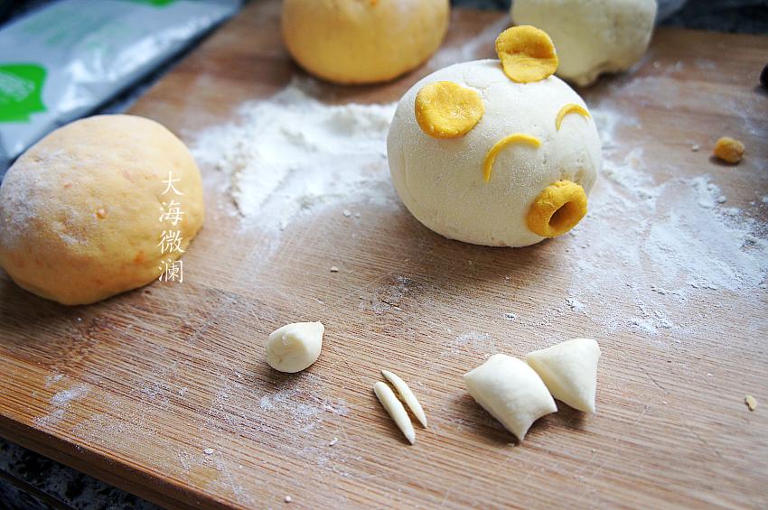 7、不同颜色搭配的小猪,用红薯泥的面团稍软一点;