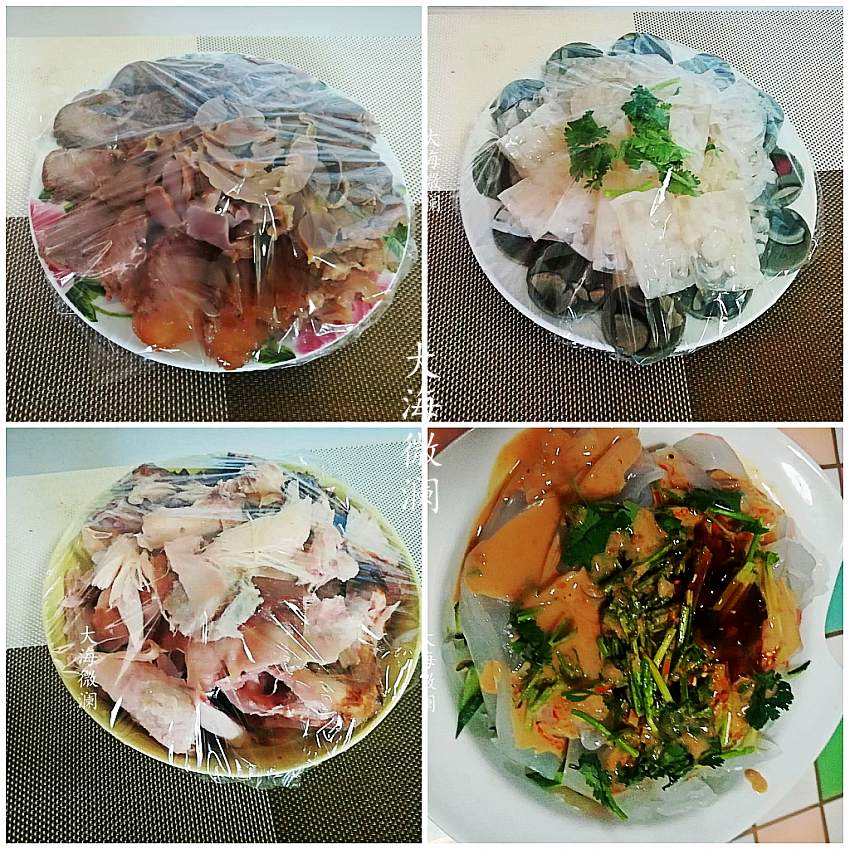 大家忙着玩,忙着吃,片片拍的不全,先上4道凉菜,酱菜拼盘、麻酱拉皮;皮冻牛肉;烧鸡。这4道菜烧鸡是买现成,其余都是自己提前备好的。酱菜就是熏酱菜包括鸡胗猪肝等,因为赶时间,这些菜都是提前一天就准备好了,一大早儿外甥媳妇就提前切好,盖上保鲜膜,吃的时候端上桌打开保鲜膜即可。