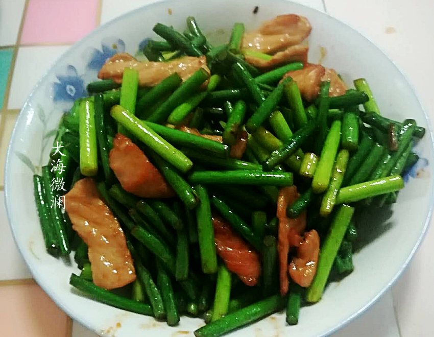 【肉炒蒜薹】 美味家常菜,在巴马这地方还没见过有卖蒜薹的呢,北方人比较喜爱的佳肴,作为北方人也想吃了。